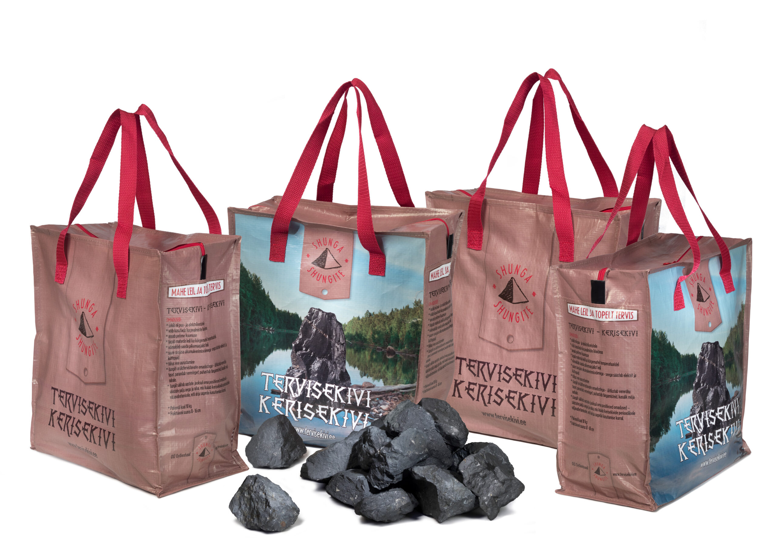 Kiuaskivet ovat pakattu kestävään pussiin, jota voi myöhemmin käyttää esimerkiksi kauppakassina.